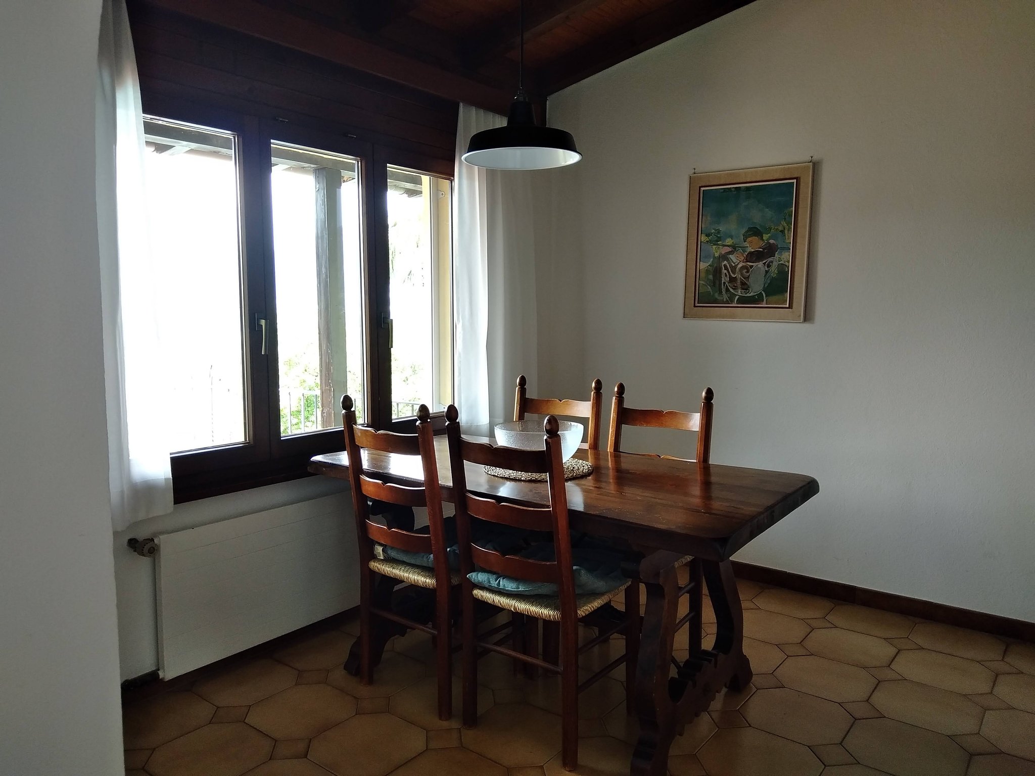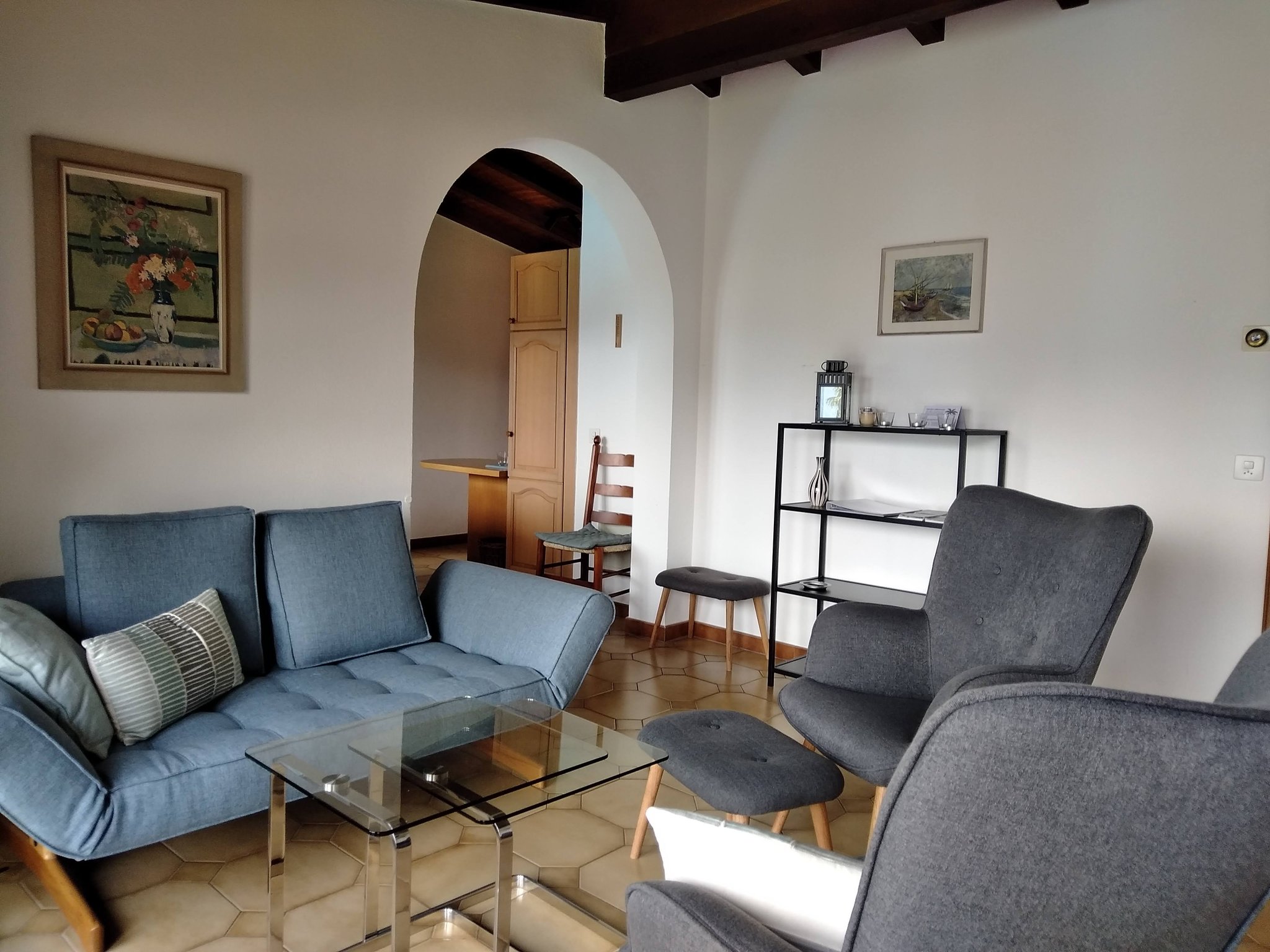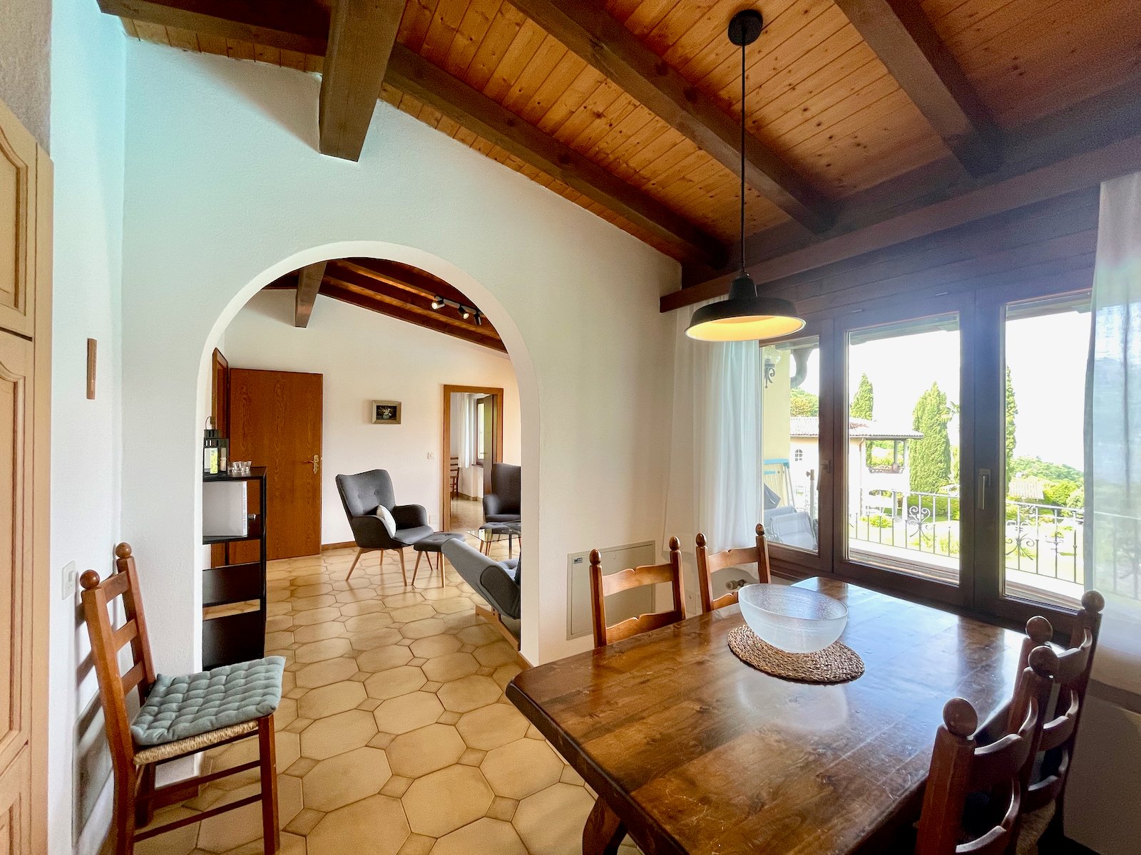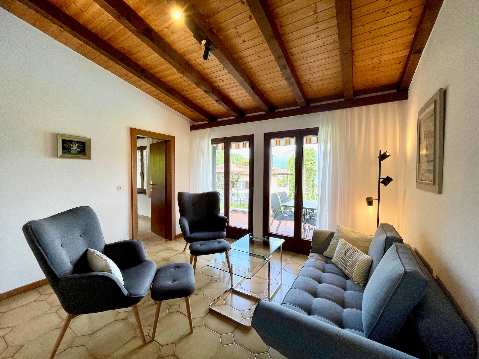 Die Wohnung "Camelia" ist im Obergeschoss vom Garten aus gesehen im Hausteil rechts. Es ist eine Dachwohnung mit Sichtbalken. Sie verfügt über einen ansprechenden Wohnraum und einen Essplatz mit offener Küche.Die grosse Terrasse mit fantastischer Aussicht wird sie begeistern. 2 Schlafzimmer, eines mit Doppelbett und eines mit einem Einzelbett sowie einem Stockbett bieten platz für 4 Erwachsene Personen oder für 2 Erwachsene mit 2-3 Kinder.